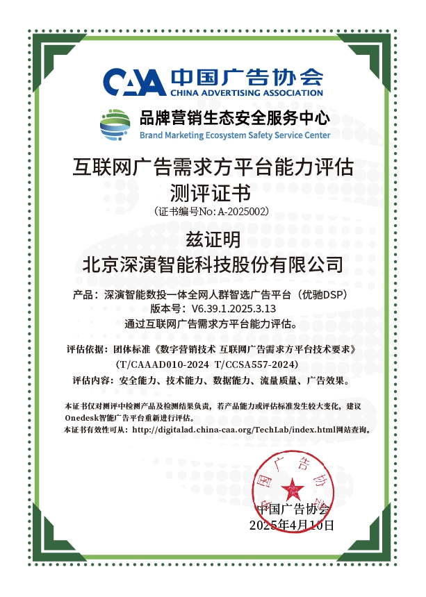 4月10日,中国广告协会发布「互联网广告需求方平台能力评估」测评结果。Martech领域领军企业尊龙凯时智能旗下产品尊龙凯时智能数投一体全网人群智选广告平台(优驰 DSP),凭借其在智能算法优化、技术创新、数据安全治理及流量质量管控等维度的突出表现,高分通过该项行业权威测评,获颁中国广告协会评估证书,成为业内首批通过认证的标杆企业。